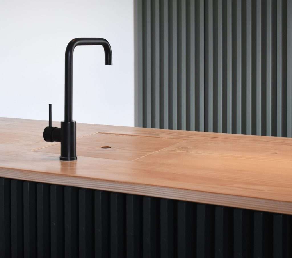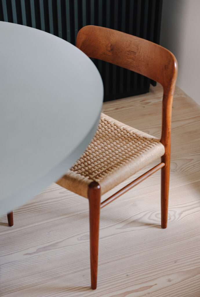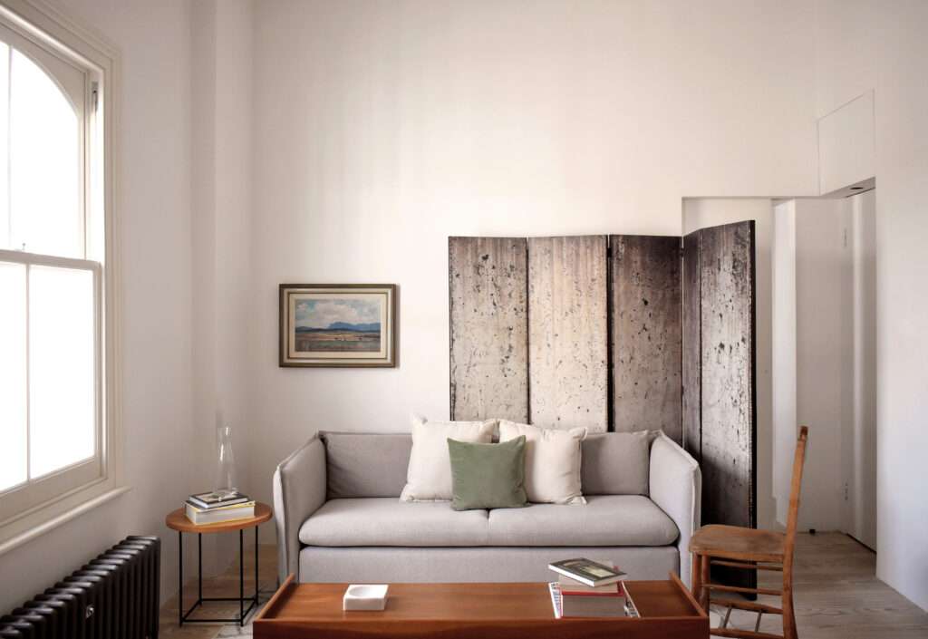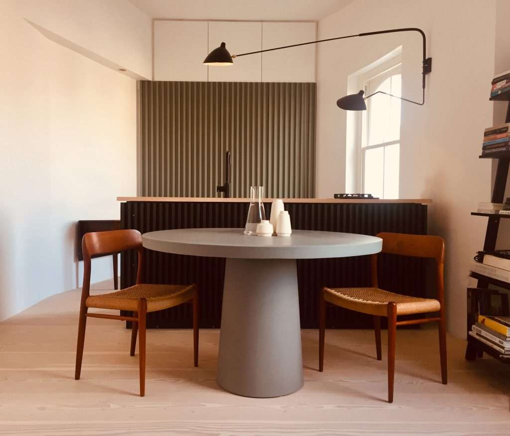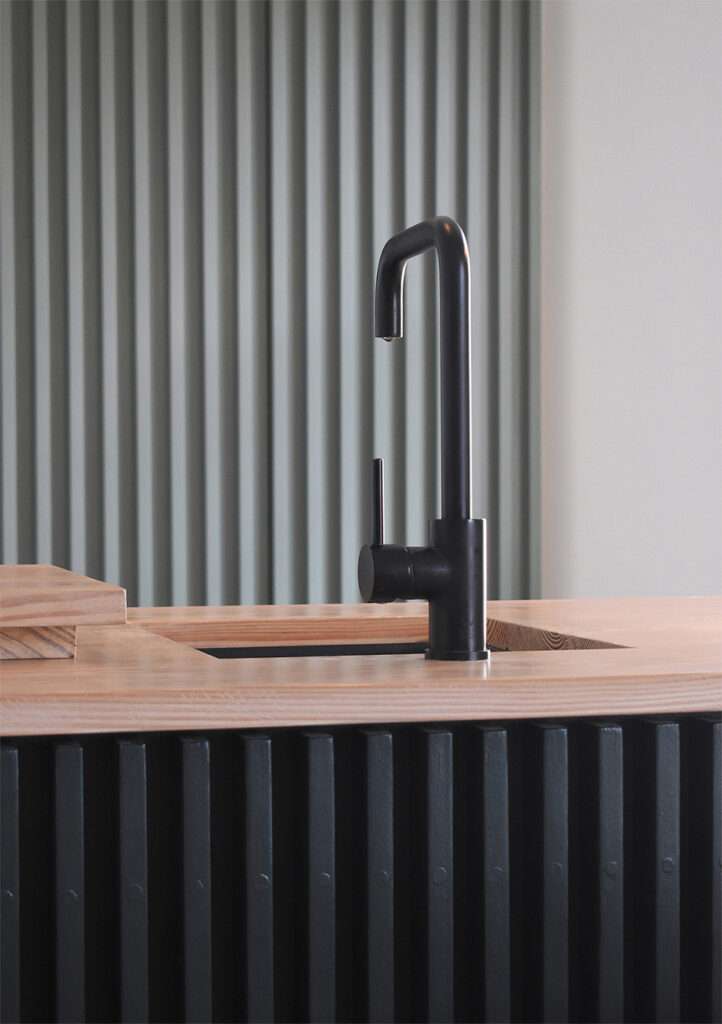 An example of the latter is the installation of fluted glass in the lower panes of the sash windows so as to block out the views of the shop fronts and traffic outside, while framing the sky and rooftops, and allowing ample natural light to flow into the interiors through the clear top window panes. The new layout and bespoke joinery regularise the shape of the rooms and optimise the use of space. A folding screen separates the entrance from the seating area, which becomes more private and cosy without the need to reduce the size of the living area with additional circulation spaces. The cooking and dining area revolves around a bespoke island whose worktop matches the long, continuous Douglas Fir floorboards stretching from one side of the room to the opposite wall. The absence of skirting boards and the use of concealed pocket doors contribute to endow the apartment with an uncluttered, peaceful aesthetic. So does the design of the pantry and utility area at the back of the kitchen: the equally spaced light green timber slats disguise the different door sizes of its units and provide a warm backdrop to the main social space of the home.
