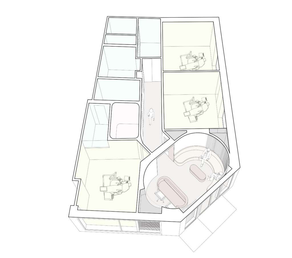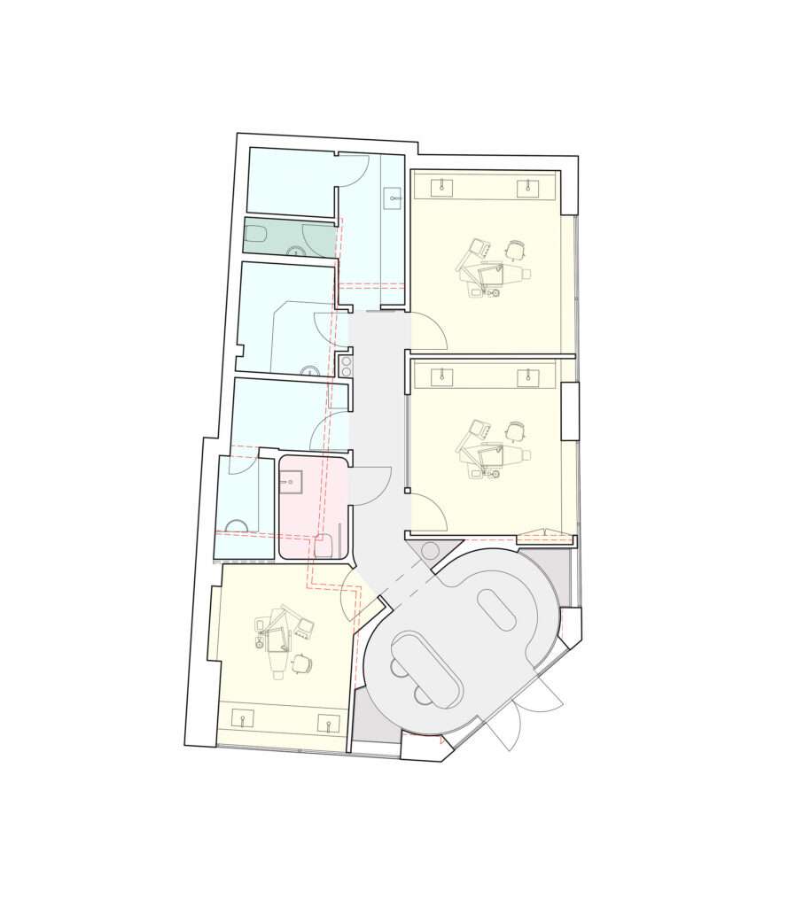 The irregular shape of the reception was altered through the use of new curved partitions that create a symmetrical, oval room that wraps around the reception desk and is transformed into a continuous curved seat on the opposite side. Storage units and shelves are hidden within this new system of partitions and bespoke, built-in furniture. The new light fittings and electric equipment are concealed throughout, and warm, pale colours and richly textures materials were selected for the finishes and furnishings, so as to create orderly, neat and serene interiors, from the entrance hall to the individual surgeries and back of house areas of the clinic.